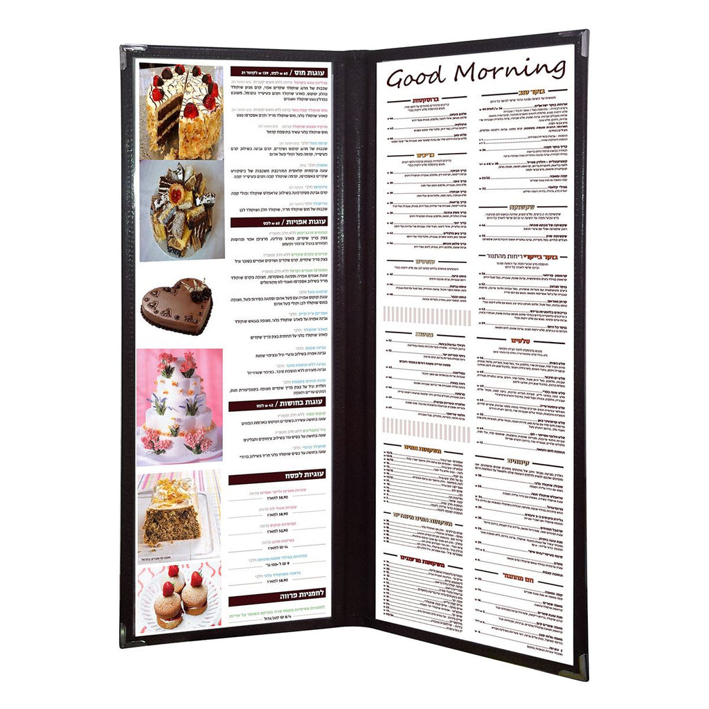אוגדן שקוף צר כפול – פתרון פרקטי ומעוצב להצגת תפריטים. האוגדן כולל שתי כנפיים שקופות משני הצדדים, עשוי דמוי עור איכותי עם פינות מתכת מחזקות לעמידות מוגברת. האוגדן מגיע בשני גדלים: שחור – גובה 38.5 ס"מ ורוחב 15 ס"מ; חום כהה – גובה 37.5 ס"מ ורוחב 17.5 ס"מ. אידיאלי לשימוש במסעדות וקפה, המאפשר הצגת תפריטים בצורה מסודרת וברורה. מספר דגם 12.5910 יחידות בקרטון 50