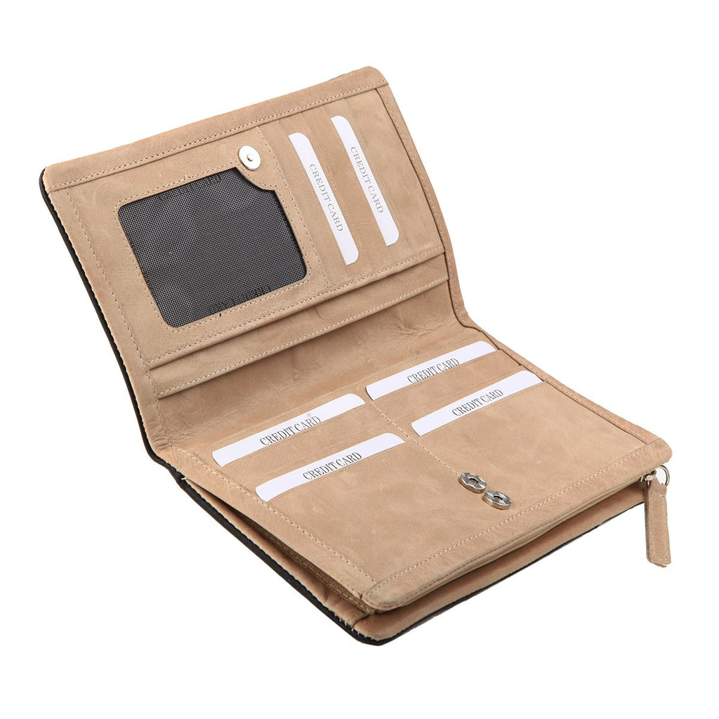 ארנק נשים מעור איכותי ועשוי מחומרים מובחרים. כולל תא חיצוני מיוחד לטלפון נייד, 11 תאים ייעודיים לכרטיסי אשראי, רוכסן היקפי לאחסון בטוח של מטבעות ושטרות, וכן 3 תאים פנימיים לאחסון מסמכים. מדגם רשום ומעוצב בקפידה.